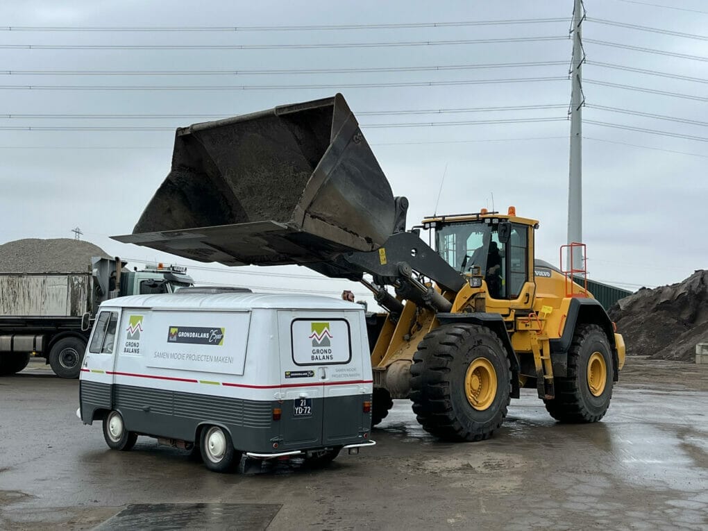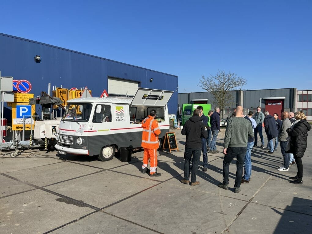 De onderstaande afbeeldingen bieden een inkijkje in de sfeer van ons project. Je ziet de wit/rode Classic Foodtruck, op maat gebrand in de kleuren van Grondbalans, met daarop teksten en hun logo's. Het geheel straalt de identiteit van Grondbalans uit.